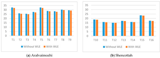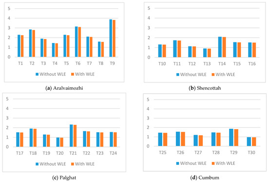 It was observed that the CoE of the turbine T1 and T5 showed the least level among other turbines in the Aralvaimozhi pass for both with and without WLE. Further, among the turbines in Shencottah pass, turbine T15 conceded the least cost of CoE, about Rs. 1.970, and this was increased to Rs. 1.999 due to WLE. The wind turbines T22 and T28 offered a reduced cost of energy, about Rs. 1.863 and Rs. 0.966 for Palghat and Cumbum passes, respectively and showed the same trend with WLE. Among the turbines from all passes, turbine T28 at Cumbum passed, performing well with the least CoE because it comprised a better cut-in-speed and rated speed of 4.5 m/s and 16 m/s, respectively, when compared with other wind turbines.