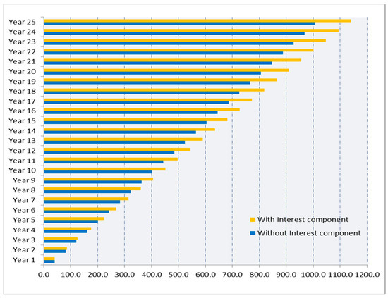 The above estimation of profit loss is furnished without considering the interest components. By considering 10% annual interest for the loss incurred due to WLE, a total loss is increasing rapidly for every year and estimated to be Rs.13.66 crores at the end of the 25th year, i.e., end of the project lifetime, as illustrated in Figure 21.