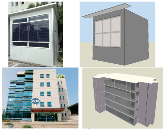 Baseline building actual configuration (top-left) [41] and corresponding DesignBuilder model (top-right). Test-building actual configuration (W16 building at KAIST) (bottom left) and corresponding DesignBuilder model (bottom right).