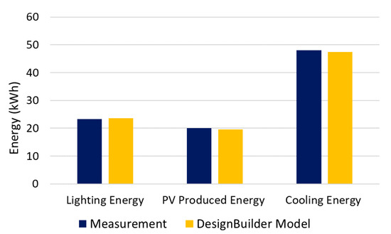 Figure 3 illustrates a comparison between the actual measurement data obtained from a precedent study [41] and the corresponding model output gained through DesignBuilder simulation. Firstly, lighting energy consumption identified by the simulation was counted up to 23.64 kWh. It was 1.5% higher than its actual value obtained by the field measurement. The observed trend for both cooling energy consumption and semi-transparent photovoltaic (STPV)-based energy generation showed a reversed pattern. Cooling energy consumption calculated by the simulation was 47.41 kWh, 1.39% lower than the field measurement, and generated energy via the photovoltaic unit approximated through the simulation was 19.66 kW, again 1.7% lower than the field measurement. Consequently, based on the model evaluation metrics described in the previous section, this baseline-building model simulation was validated [45].