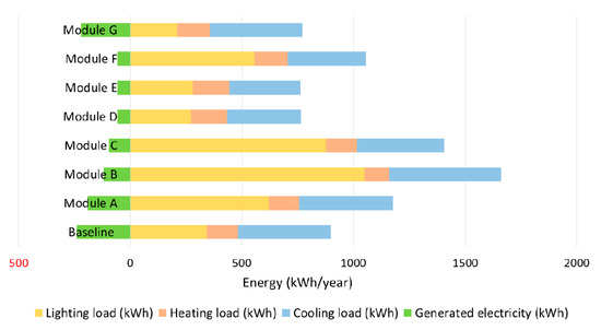 Module A showed the highest maximum power generation characteristics, around 77.42 Wp/m2. However, module A’s power generation was 13% less than module G, which yielded 39.56 Wp/m2. This difference is ascribed to the fact that module G’s efficiency is 11% while that of module A is 8.02%. Even for the modules having the lowest efficiency (module D, E, and F), those modules generated only 74.5% less than module G. These findings also confirm that applying a higher efficiency module (Module G) would be beneficial for a smaller area of photovoltaics rather than using the module with the maximum power output (Module A). The window area of the baseline building is minimal considering its size, so choosing a higher efficiency module would be preferred.