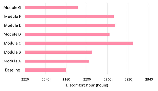 Discomfort hours are also related to the module characteristics described in Table 3 where module C shows the highest discomfort hours. Module C also is characterized by the lowest U-value and SHGC for its thermal characteristics. The gap between the lowest and the highest discomfort hours is not significant enough (around 2%) compared to the energy consumption case.