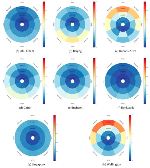 The newly proposed index, the electricity balance index (elBI), was examined to compare the baseline STPV module’s performance in different geographical locations. Figure 7 shows the radial heat map in Chengdu, China (baseline building location), and Figure 8 illustrates a radial pie chart representing elBI indicator values calculated for different locations. Orientations were divided into eight categories, i.e., North, Northeast, East, Southeast, South, Southwest, West, and Northwest. Layers in the concentric circles represent varied window-to-wall ratios: 75% in the outer layer, 50% in the middle layer, and 25% in the inner layer. The color in each segment shows the value of the elBI indicator; a red color indicates higher values, and a blue color signifies lower values. A higher elBI value implies that the corresponding STPV module’s electrical power generation is more likely to meet the building’s energy consumption requirements.