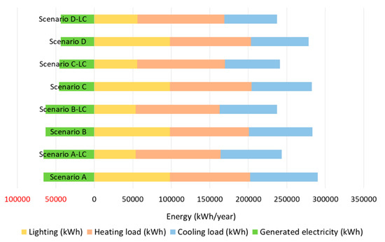 Figure 10 summarizes simulation outcomes for each tested scenario and includes energy generation, cooling, heating, and lighting energy consumption. Scenario A shows the highest electricity generation, while scenario D marks the lowest power production. The lowest cooling and heating energy consumption is associated with scenario D and scenario B, respectively. The same lighting energy consumption across all tested scenarios was identified, and these scenarios did not include any lighting control systems for indoor spaces.