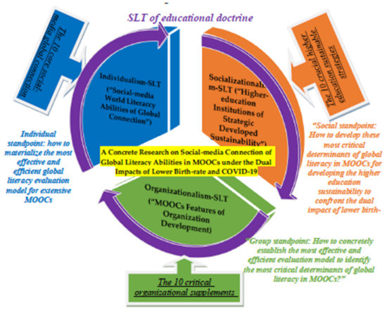 However, according to a widespread survey on related studies [13,14,15,16] of social media, MOOCs and higher education sustainability and student’s literacy, there is no research able to consolidate these interdisciplinary subjects together in order to deeply assess their interactive dependences. Hence, this interdisciplinary global literacy research project aims to break down the major research mainstream question: “How to explore the most critical determinants of social-media connection of global literacy abilities in MOOCs for developing the higher education sustainability under the dual impacts of lower birth-rate and COVID-19?” has be broken by the Social Learning Theory (“SLT”) of educational doctrine as the three most critical research questions [17]. Significantly, “Social-media Global Connection of Global Literacy Abilities”, “MOOCs Features of Organization Development”, “Higher Education Strategies of Developed Sustainability” were able to be synthetically outlined by the trigonometric analyses of the Social Learning Theory (“SLT”) to comprehensively assay this major research mainstream [18]. The reasons are each dependence and influence among three essential dimensions (individualism-individual aspect, organizationism-organization aspect and socializationism-society aspect) are discussed in detail and evaluated in SLT theory. The reasons are: (1) individualism was able to directly affect the organizationism and socializationism perspective as individuals are the basic unit for organization and society; (2) organizations must indirectly impact individuals and society as humans necessarily live in groups and majority decisions exist in society and finally, (3) socializationism reversely influences on organization and individual since majority rule always dominates individual thinking and organization development tendencies [19,20]. In order to comprehensively solve the three most critical research questions, this interdisciplinary global literacy study has expanded a series of research results and analytical consequences of authors’ accumulated publications on global literacy, technological education, MOOCs and student’s learning behavior. It refined in depth the “Social-media Connection of Global Literacy Abilities” for “Individual standpoint: how to materialize the most effective and efficient global literacy evaluation model?; “MOOCs Features of Organization Development” for “Group standpoint: How to concretely establish the most effective and efficient global literacy evaluation model in MOOCs of higher education institutions?” and “Higher Education Strategies of Developed Sustainability” for “Social standpoint: how to develop the most effective and efficient global literacy evaluation model in MOOCs to induce the most critical MOOCs global literacy determinants to activate the developed sustainability of higher education institutions to confront the most serious dual impacts of lower-birth-rates and COVID-19?”. These three research questions are the interdisciplinary analytical criteria to concretely establish the most effective and efficient evaluation model to identify the most critical determinants of global literacy in MOOCs [21] in this research.