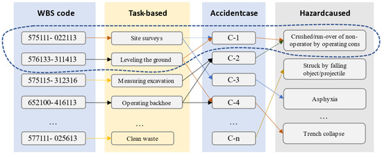 The dashed curve section of Figure 3 and Table 2 exemplified the logic of hazard identification based on the spatial–temporal overlap condition. For instance, after analyzing the accident description listed in Table 2, “site surveys” and “leveling the ground” are observed as PA leading to risk. The hazard and WBS code are determined (indicated by the dashed curve). After that, the input data, including the name of the report, description, SIC code, accident extent, activity interaction, resource, WBS code, and warning, are retrieved from the entire database, as listed in Table 2.
