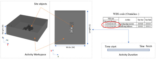 Additionally, the SCI is also designed to generate the activity workspace modeling, as depicted in Figure 4. This study leverages the BIM aided activity workspace modeling for visualizing the construction entities (components, equipment, and materials) that are required during activities. The required workspace for activity is created from the 3D model using the concept of the axis-aligned bounding box (AABB) [52,55], which is linked to the site object and estimates the area used for each task. The interactive development and allocation of the workspace are aided using python in the visual programming. The workspace is defined by AABB’s dimensions (width, depth, and length) and the coordinates are relative to the 3D model origin. For example, in Figure 4, the activity named “backfill using bulldozers” is presented by WBS code, 3D workspace, and schedule. The activity workspace includes the bulldozer object and its surrounding area. The bulldozer object’s bounding box is generated. As the construction job site is dynamic, the proposed module is designed to be flexible, and the planner’s decision could reflect protraction and contraction in the box if required. The WBS code “31232313-41611600” is assigned as parameters to integrate 3D and schedule to generate a 4D BIM-based activity model, as mentioned in Figure 4.