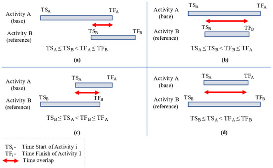 During the planning stage, the activities include the start and finish times. To detect overlapping of pair-wise activities, four cases are considered for comparing the base activity with the reference activity, as depicted in Figure 5. According to Figure 5a, the base activity begins before the reference activity and terminates while the reference activity is still in progress. In Figure 5b, the overlap is noticed if both the start and finish times of the reference activity are between the start and finish times of the base activity. Overlapping occurs when the base activity’s start time is between the start and finish times of the reference activity, even if the base activity finishes before or after the reference activity, as indicated in Figure 5c,d.
