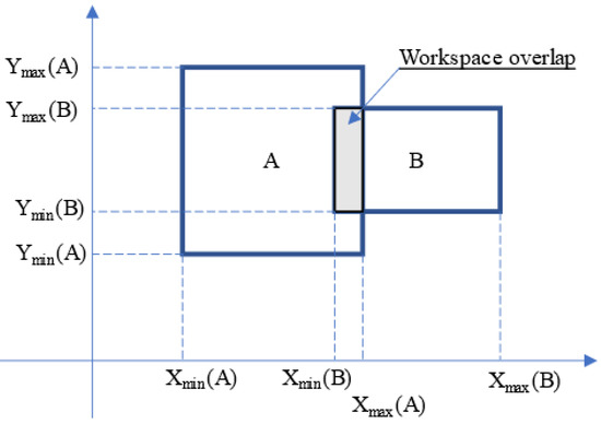 The axis-aligned bounding box (AABB) intersection test is used for detecting work-space overlap. Workspace A (base) is described as (); similarly, workspace B (reference) is described as (). The condition for the overlap to occur is given by Equation 2. The two-dimensional plane’s (x-y axis) intersection of two workspaces (A and B) is simplified in Figure 6 when is less than or equal to , and is more than or equal to ; simultaneously, is less than or equal to , and is more than or equal to . Further, due to the characteristic of the 3D workspace model, the workspace intersection has to be satisfied all together following the z-axis described by is less than or equal to , and is more than or equal to .