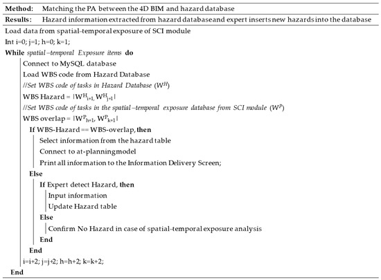 The SII module is designed to enable project teams to detect safety hazards automatically during the planning stage. The system computes PA with spatial–temporal overlap condition obtained from the SCI module and matches with the hazard database developed in SHI module. Figure 7 shows the algorithm of matching the pair-wise activities between the 4D BIM planning and hazard database. The initial input is to load spatial–temporal exposure cases from SCI module. Then each case is checked with the hazard database built from SHI module in the while loop. If the PA determined from SCI module matched with the hazard database, then it means that the given activities have an accident in the past. Moreover, it is supposed to be potentially hazardous activities for each other; hence, safety professionals have to re-define the PA’s risk level. Contrarily, the safety professionals further review the PA’s potential risk to convey the outcomes to other stakeholders. The resulted warning information would help to enrich the hazard database using for the upcoming projects. The PA exported from SII module are visualized in the web-based system 4D BIM simulation, as demonstrated Section 4.