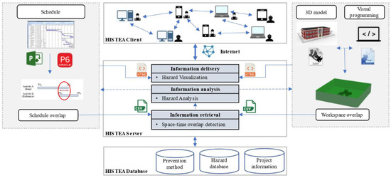 The 3D CAD system and a visual programming tool (Grasshopper) was employed to detect workspace overlap (spatial conflict). Moreover, the workspace overlaps of the corresponding activities are compared with the time aspect using the scheduling tool (MS Project) to identify the schedule overlap (temporal conflict). The spatial–temporal conflict of PAs was visualized in a web-based 4D BIM environment. The HISTEA system can detect potential hazards of PAs by matching them with the hazard database developed from IMIS-OSHA. A simple project obtained from the Autodesk library was used in this research to demonstrate the functionality and applicability of the HISTEA.