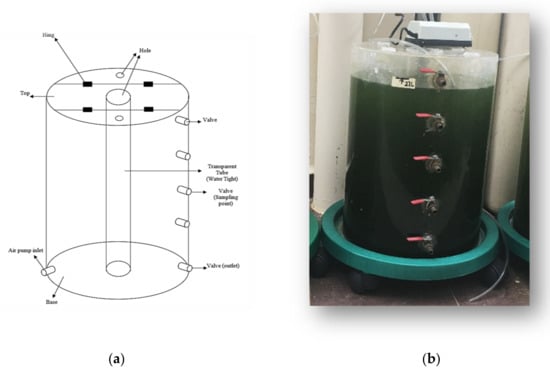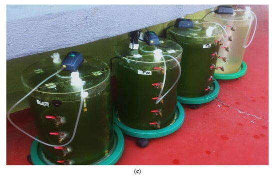The biomass production was performed in the photobioreactors scale up depicted in Figure 1. The construction of the photobioreactor was performed based on Yen et al. [] with some modifications, such as diameter and height of photobioreactor tube (Figure 1a,b). Four tabular vertical closed photobioreactors were designed and constructed using transparent acrylic materials with the total working volume of 25 L. The photobioreactors were washed using Decon 90 detergent for surface disinfection, followed by three washes with sterile distilled water. A total of 20 L with different concentrations of WMW was transferred to each photobioreactor with different aeration rates (triplicates) (Figure 1c). The initial microalgae density used was 8.9 × 106 cells mL−1. The photobioreactors were placed under outdoor sunlight at temperatures ranging from 24 °C to 34 °C. The microalgae were allowed to grow for 14 days before the harvesting process.