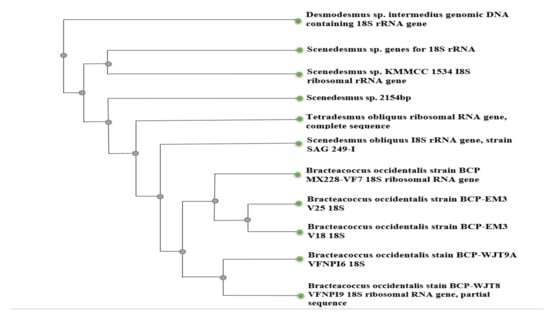 Extraction of DNA from isolated species was performed using cetyl trimethyl ammonium bromide [,]. Five μL of extracted liquids was run on test gel, and as a result, one DNA species was obtained. The 18rS rRNA of nuclear encoded was amplified by polymerase chain reaction (PCR) as it ran repeatedly in 30 cycles of 95 °C, 5 min; 94 °C, 45 s (denaturation); 55 °C, 30 s (annealing); 72 °C, 2 min (DNA synthesis, elongation); 72 °C, 10 min; and 4 °C hold. Following the amplification, the PCR were then purified using a purification kit by Sigma and checked on 1% agarose gel for sequencing preparation. The DNA of Scenedesmus sp. profile was also verified by National Center Biotechnology Information (NCBI) and Molecular Biology Services, Species Barcoding Report; www.base-asia.com []. The preparation of Scenedesmus sp. isolated were cultured in Bold Basal Medium (BBM) (Bischoff and Bold) [] as described in the previous work [].