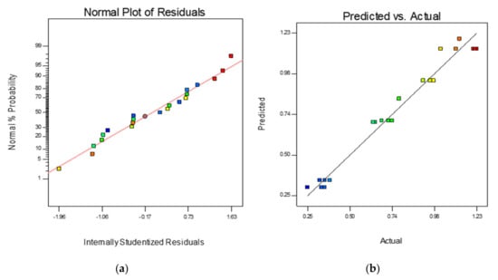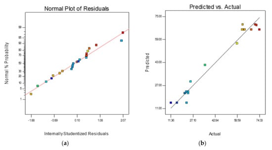 The smaller p-value and larger F-value (Prob. > F) make the model more significant of the corresponding coefficient []. According to Table 4, the lack of fit value was 1.37, and there was a 30% possibility that lack of fit value can occur due to numerical noise and showed that this model is good. The noise signal was measured by the adequacy precision, where it comprised the predicted value at the average prediction error and the design points. The adequacy precision in the present work was 22.739, which means this desirable ratio is greater than 4, and the developed model can be used to guide the design space. In order to check the data analysis of the experiment, the adequacy of the developed model was the main part for this design. The adequacy of the model was evaluated using a diagnostic plot for normal probability plot and predicted vs. actual plot, and can be seen in Figure 4a,b. Figure 4a illustrates the residual points were located on the straight line for biomass productivity response and considered that the residual points were in normal distribution for the response of the model. Hence, the predicted vs. actual plots obtained from the presented model indicated that the data were matched well between actual and predicted (Figure 4b).