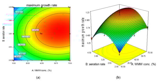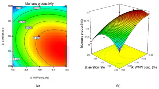 Little scattering plots in the data were expected, as it could be presumed that the data were normally distributed. Figure 5a,b demonstrates the contour plot and three-dimensional (3D) surface response as a function of the WMW concentration and aeration rate. The 3D surface shows that the maximum response for biomass productivity was 74.33 mg/L/d at 42.5% of WMW and aeration rate of 3.25 L/min. Increasing the aeration rate (4.0 L/min) and decreasing the WMW (10%) had the minimum result of biomass productivity (11.36 mg/L/d). In other words, the effects of WMW were opposite to the aeration rate effects when the figure revealed that, by the increasing of WMW and decreasing of aeration rate, the biomass productivity was increasing accordingly. Mutual interaction of WMW concentration and aeration rate also achieved the highest growth rate by using statistical analysis. The results of the quadratic model for maximum growth rate in the form of analysis of variance (ANOVA) are as shown in Table 5.