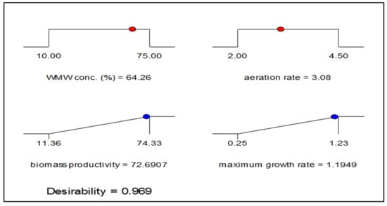 Furthermore, by increasing the aeration rate at 4.5 L/min, the biomass productivity and maximum growth rate were among the lowest. This situation might be due to the increase of shear stress and breakage of microalgae cell of high aeration rate since a study by Alipourzadeh et al. [] had the same situation, where they recorded the optimum aeration rate at 3.1 L/min and negative growth effect at 5 L/min. The determination for optimum performance was established by a desirability function that can come out with one or more responses. The goal fields in the model had five options; maximize, target, in range, and equal to. Meanwhile, the main goal of this model was to maximize biomass productivity and growth rate. In the present model, the numerical optimization was chosen in order to find the optimum point that suited the desirability function as shown in Figure 8.