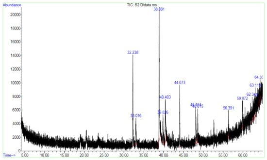 The GCMS of Scenedesmus sp. cultivated from WMW revealed 13 fatty acid compounds with their chemical formula, compound nature molecular weight, retention time area, and biological activity, which are illustrated in Table 8. The peak at the retention time of 38.833, which can be seen in Figure 9, is named hexadecane; it was the major hydrocarbon compound which can be employed for biodiesel production. The second, less prominent peak at 16.17% indicated the presence of glaucine. Glaucine also known as an antitussive agent in orally ingestion to increase airway conductance in humans []. Meanwhile, the third less significant peak at 48.108 retention time with a peak area of 8.33% showed the characteristic of phytol; a synthetic form of vitamin E and vitamin K1 and has been suggested to have metabolic properties as well as anti-inflammatory effects []. These bioactive metabolites of Scenedesmus sp. has beneficial interest in the development of new products for chemical, cosmetic, medical and these chemical compositions may be potentially significant as chemical value added in biotechnology applications.