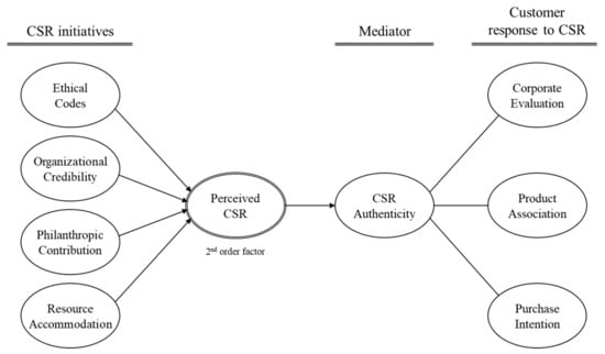 In accordance with the above discussions, this study focused on the mediating role of CSR authenticity to investigate the effect of customers’ perceived CSR on customers’ response. In order to understand the authenticity of CSR activities, individuals comprehensively consider various factors related to CSR []. Thus, we consider comprehensive CSR building blocks for perceived CSR ethical codes, organizational credibility, philanthropic contribution, and resource accommodation, proposed by Luo [], in order to adequately capture dimensions of CSR most relevant to this study from the perspective of authenticity. Finally, we suggest theoretical and managerial implications for discussion of consumer judgments and evaluation criteria for CSR activities.