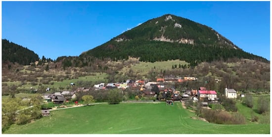 The UNESCO site Vlkolínec is located in the northern part of Slovakia and administratively belongs to the town of Ružomberok (Figure 1). Vlkolínec was established at the turn of the 14th and 15th centuries and its inhabitants made their living through agriculture, breeding of cattle and sheep, logging, beekeeping and the production of shingles []. The historical character of the Vlkolínec settlement with unchanged wooden log houses has been preserved mainly due to its isolated location in the Veľká Fatra mountains at an altitude of 718 m above sea level at the southern foot of the Sidorovo hill (1099 m above sea level), which is the dominant feature of the area (Figure 2). Its traditional folk architecture and natural environment with narrow strips of fields, wide meadows and pastures gave it a rare and unique but fragile genius loci. As a result of social changes, these traditional forms of farming gradually began to disappear from the landscape in the 1950s, and many disappeared altogether. As a result, the characteristic appearance of the Vlkolínec protection zone changed.