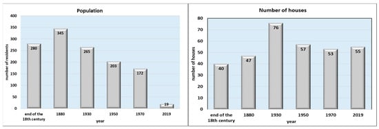 The development of the population can be followed only on the basis of historical sources; according to these historical sources, a total of 117 people lived at Vlkolínec in 1766, which grew to 334 in 1825. In 1869, Vlkolínec had its largest population of 345 inhabitants (Figure 3). Subsequently the population decreased to 265 in 1935, 203 in 1950 and only 172 in 1971 [,]. At present, only 19 people live at Vlkolínec. A similar trend can be found when we look at the development of the number of houses. At the end of the 16th century, there were about 5 houses at Vlkolínec, with 4 settlements (sessia) and 5 houses owned by five peasants (serfs). At the end of the 18th century there were 40 houses and in 1880 there was a total of 47 houses. In 1930 there were 76 houses and the maximum number was reached in 1935 when there were 82 houses. At this point of time, house numbers were assigned for the first time. In 1944, during the Slovak National Uprising, 13 houses burned down. At present, there are 55 houses at Vlkolínec (of which only 6 are permanently inhabited by 19 inhabitants) and 2 of them are brick houses [].