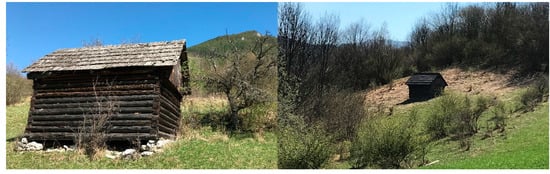 Log haybarns are located on higher meadows around Vlkolínec. It is estimated that at the time of the greatest development of the village, there were about 60 of them in its vicinity []. At present, the haybarns no longer fulfil their function, many have already disappeared and those that have been preserved are in poor technical condition. Since 2008, they have been filled with hay from mown meadows, which are used for winter feeding of forest animals (Figure 4).