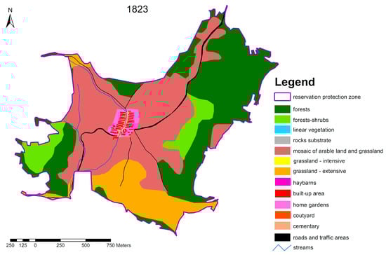 In the first half of the 19th century (1823), the character of the area began to change (Figure 7). The morphometric parameters represented on the main influence for the decrease of arable land in mosaics with permanent grassland (almost 40% of the area). This decrease occurred to the benefit of grasslands in the southern part of the territory, the share of which increased to almost 14%, with an increase in the share of forest stands in the eastern part. Forest stands accounted for 35% of the area. In this period, we identified a relatively high proportion of forest cover (7.5%) in the former mosaics in the NW part of the territory. In addition to built-up areas, house gardens, yards and cemeteries, we also managed to identify haybarns. The occurrence of these farm buildings is related to the growth of compact grasslands in the area and the need for seasonal hay storage.
