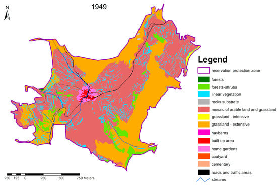 More than a hundred years later (1949), a significant difference in land use can already be seen (Figure 8). The changes occurred mainly in the decline or extinction of forest stands (only 0.05%) and forest cover (5.23%), which were preserved, mainly in the vicinity of watercourses. Forest stands were transformed mainly into extensive grasslands. Grasslands made up 33% of the territory, and we have identified linear woody vegetation (7.27%) primarily in the vicinity of roads. The area had become significantly transformed into agricultural area. More than 50% of the area consisted of mosaics of arable land and permanent grassland. There was also a slight decrease of the built-up area—this was caused by the destruction (burned down) of several buildings during World War II.