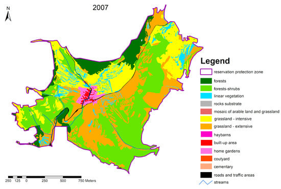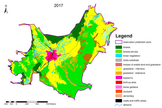 The use of land in 2017 was very similar to 2007. With the adjustment of extensive stands and the extinction of some linear stands, we could see an increase in large-scale intensive grasslands to 34% (Figure 10). A similar trend (slight increase) could also be observed in forest stands and forest shrubs—some of the internal grasslands were being overgrown. In the area, we still managed to identify historical buildings such ashaybarns as the relics of the original cultural landscape.