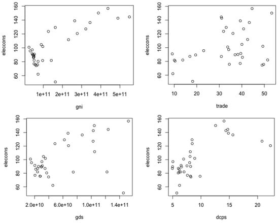 In this section, the time series static, finite distributed lag, and ARIMA test model estimation results are discussed to check the effect of economic development on electricity consumption and carbon emissions, as well as the impact of carbon emissions on electricity consumption in Nigeria between 1981–2014, and 1971–2014 respectively. Economic development indicators used include GNI, trade, GDS, and DCPS. To first get a visual representation of the correlation between these variables, bivariate scatter plots have been provided in Figure 2 and Figure 3 showing the effect of electricity consumption on economic development from 1981–2014, and then the carbon emissions and electricity consumption nexus effect.