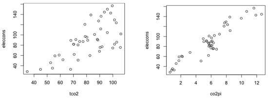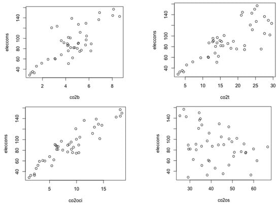 Two time series data sets have been collected for Nigeria. First, economic data and electricity consumption data between 1981–2014, and carbon emissions and electricity consumption data from 1971–2014. The analysis is done by using the time series linear regression model according to the literature specifications [,]. First, the analysis is done in static form, and then in one-year finite distributed lag form with all autoregressive dynamics in place. The standard static time series formula is therefore implemented as: