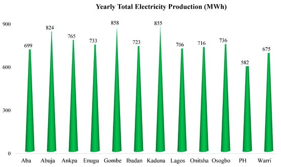 In this study, a 500-kW PV system is simulated based on technical and economic parameters in order to determine its viability in different locations in Nigeria. RETScreen simulation program has been used for the analysis and the feasibility will be determined based on different economic indicators (PBP, IRR, NPV). For comparison purposes, the capacity of the PV plants is the same for all the locations considered and therefore the required solar collector area (3266 m2) is the same. However, the electricity production from the PV systems varies from one location to the other as seen in Figure 5. Typically, the solar radiation in the northern part of Nigeria is higher (Table 8) in comparison to the other parts of the country. This is evident in the electricity produced for the PV plants analysis in Northern locations namely; Gombe (858 MWh/yr), Kaduna (855 MWh/yr), and Abuja (824 MWh/yr). Based on the result of the analysis, Port-Harcourt (PH) had the least yearly electricity export rate (582 MWh/yr) followed by Warri (675 MWh/yr) and Aba (MWh/yr).