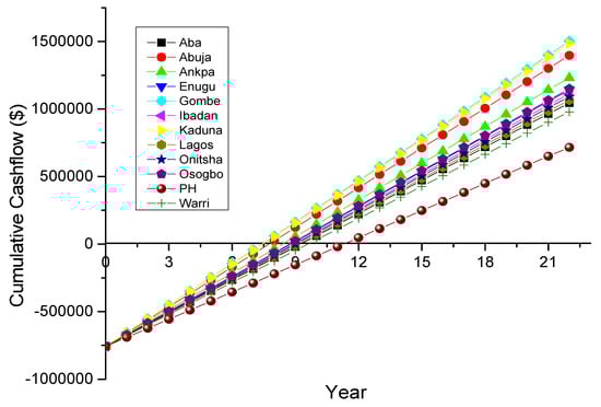 The electricity production rate of the PV plant for each of the locations is directly proportional to the cumulative cashflow rate (Figure 6). While the cash flow for the Northern locations is higher, locations like Ankpa, Enugu, Ibadan, Osogbo, and Onitsha all had a comparatively similar income cashflow rate. Although the use of storage systems has not been considered in the scope of this study, the yearly electricity production from the PV plants in all the locations shows the potency of the technology for solving the current electricity crisis. Considering the NPV, IRR, and PBP for the projects in all the locations, it can be concluded that the use of solar PV is economically viable. A project is said to be feasible if the NPV is greater than 1. As seen in Table 10, the net present value for all the locations is between $794,108 and $1,245,681. This further justifies the importance of decentralized renewable energy-based off-grid systems for meeting Nigerians electricity needs.