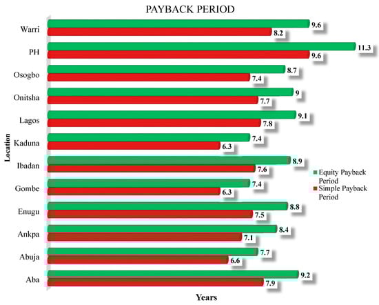 The pre-tax and after-tax IRR also reflect that the use of solar PV for electricity production will be a good investment for both private individual and commercial companies/organization. Since solar radiation is mostly available during working hours, the integration of solar PV plants without storage systems will be more suitable for office/commercial buildings. The simple payback period and the equity payback period of the project in all the locations is also very feasible. For Gombe and Kaduna, the simple PBP and equity PBP are 6.3 years and 7.4 years respectively (Figure 7). it is noteworthy that the simple PBP and equity PBP for all the locations are less than 10 years (excluding Equity PBP for PH). This further shows that this is the right way forward if the country will solve its electricity crisis soon.