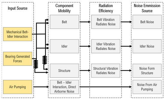 This phenomenon was carefully analyzed on an example of belt transmissions located in closed spaces [22]. The schematic diagram in Figure 1 shows noise generation mechanisms in belt conveyors [12].