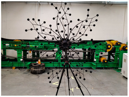 The tests were performed with the use of an acoustic camera CAE Software and Systems GmbH, Gütersloh, North Rhine-Westphalia, Germany (Figure 2), which allows the locations of the main noise sources in the analyzed machine to be identified simultaneously. An acoustic camera is a combination of two devices: a video camera and measurement microphones. The measurement microphones record changes of the acoustic pressure, while the video image is simultaneously recorded with the camera. Such a synchronization allows simultaneous sound pressure measurement and spatial identification of the noise source. The camera used in the measurement equipment has a Bionic L-112 microphone array containing 112 MEMS microphones and is 1.7 m in diameter. Its maximum sample rate is 48 kHz for the frequency range of the sound pressure between 10 Hz and 24 kHz. The operating principle of an acoustic camera is based on beamforming methods, which allow precise calculations of noise emission delays by several sources for individual micro-phones [23]. The video image and the recorded sound are sent via an Ethernet interface to the computer, in which the data are then combined and analyzed. With the help of included algorithms, the dedicated CAE Noise Inspector software allows sound distribution maps to be developed. As a result, the main noise sources can be located, and the absolute values of sound pressure levels can be identified. The camera enables the recording of the sound pressure level already at 33 dB and up to 120 dB, with dynamics up to 40 dB.