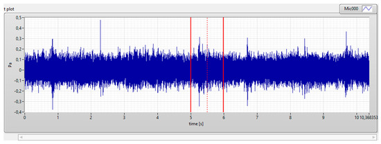 Measurements in laboratory conditions allow the elimination of the influence of the background noise on the measurement results. Owing to this fact, the source of noise can be located precisely. The maximum and minimum distance between the acoustic camera and the investigated object is limited by the measurement range of the microphones. The acoustic camera was positioned at a distance of 4.1 m from the belt conveyor. Ten-second signal samples were recorded with a sampling rate of 800 Hz (Figure 3). The recorded signals were divided in order to obtain 1-second samples, which were subsequently subjected to direct analysis. Individual analyses of the signal split into shorter time intervals facilitates the interpretation of the obtained results and results in a shorter data processing time. The general noise of the entire laboratory belt conveyor, as identified from the recorded time signal, was 73.32 dB. This is noise for the full range of frequencies found in the spectrum.