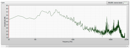 The noise generated by the electric motor is the result of its internal electromagnetic processes. The frequency is equal to double the power-line frequency, but also depends on the design parameters of the motor, such as for example the number of pole pairs. The research on this issue demonstrated that these are typically the higher harmonics of the base frequency (>600 Hz) [27,28,29]. The noise frequency of the electric motor in the measurement rig is within 852–853 Hz, with the maximum sound level for this frequency being 43.2 dB (Figure 9).