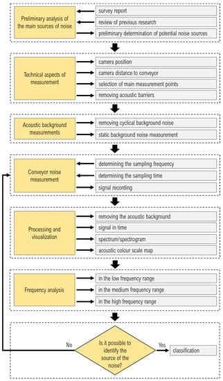 The schematic diagram below (Figure 5) presents the successive steps of the research into noise sources in a belt conveyor.