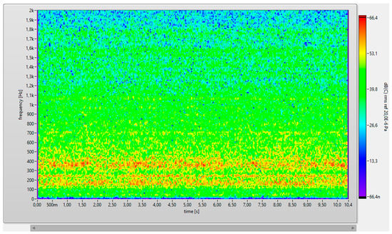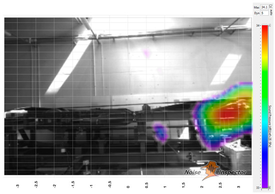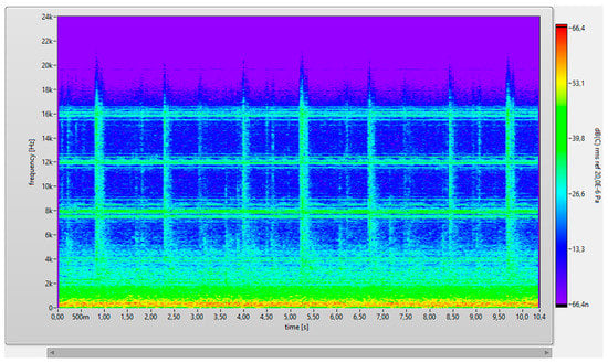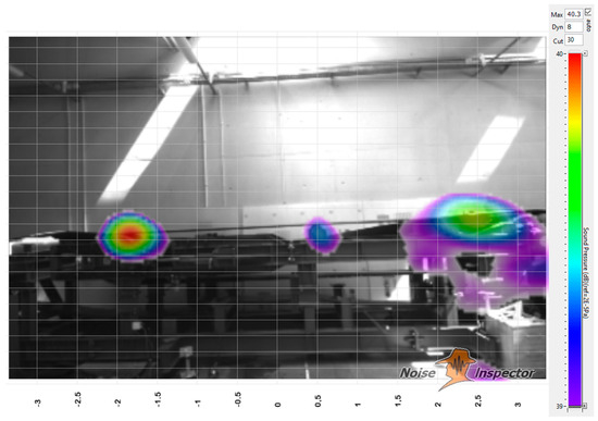 Dominant frequencies in the 8000–9000 Hz range can be clearly identified in the noise spectrum. The data from the acoustic camera indicate that these are higher harmonic frequencies of the motor. Figure 15 shows the noise in the conveyor at the level of 34.1 dB, which corresponds to the frequency range of 8000–9000 Hz.