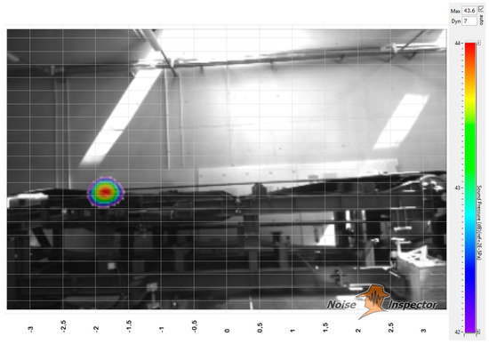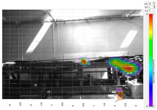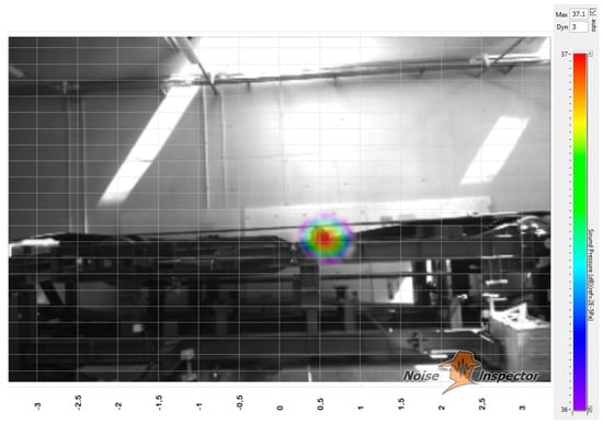 The rotating idler loaded with the belt generates noise, which is the effect of the interaction between the bottom cover of the belt and the idler coat. The noise may increase as the bearings in the idler become increasingly worn [20]. In the case of the belt-idler interaction, the idler coat is the main source of noise [13]. Noise from the idler bearings is typically located within the range of 1000 Hz to 3000 Hz (the frequency of up to 1000 Hz is from the vibration in the bearings). The noise due to the belt-idler interaction (the result of the rotating idlers), such as transverse belt vibration or vibration on the structure of the conveyor route, is within the low frequency range, up to 100 Hz [20]. An acoustic camera does not allow measurements in a low part of the low-frequency range (less than 20Hz). The noise source in the area of the idler (the idler bearing) generates the maximum sound level of 37.1 dB within the frequency range of 1580–1581 Hz (Figure 11).