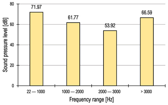 Mean sound pressure levels were identified for each of the frequencies. Their numerical values are shown in Figure 16. The highest-pressure level was identified for the frequency in the range of 22–1000 Hz. In the higher frequency ranges, the mean sound pressure level was significantly lower. This fact indicates that the majority of the noise nuisance is generated by the elements that generate noise in low frequencies. Importantly, the frequency ranges used in the evaluation are illustrative, as they are based on the observations and assumed for the purpose of noise analyses in laboratory conditions.
