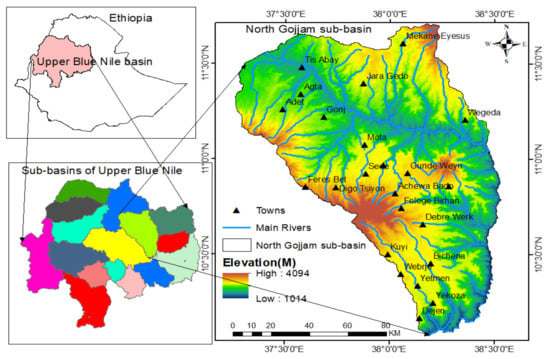 The North Gojjam sub-basin is located between 38.2° E to 39.6° E longitude and 10.8° N to 11.9° N latitude. It is one of the major tributaries of the Blue Nile/Abbay river (Figure 1). Its area covers about 1,431,360 ha, which stretches between Choke and Guna mountains. The total population of the sub-basin and surrounding villages at the time of the study was 3,565,892 [40], settled in scattered areas. The altitude of the sub-basin ranges from 1044 to 4048 masl (Figure 1). The dominant agro-ecological zone is characterized by tepid to cool moist middle highlands, and cold to very cold moist sub afro-alpine to afro-alpine highlands [41]. According to the Ethiopian National Metrological Agency, the average maximum and minimum temperature of the sub-basin varies from 24.6–28.1 °C and 11.0–14.5 °C, respectively, and the mean annual temperature is 19.4 °C [42]. The rainfall pattern is closely correlated with the annual migration of the inter-tropical convergence zone (ITCZ) and most rainfall occurs in the summer, from June to September [41,42].