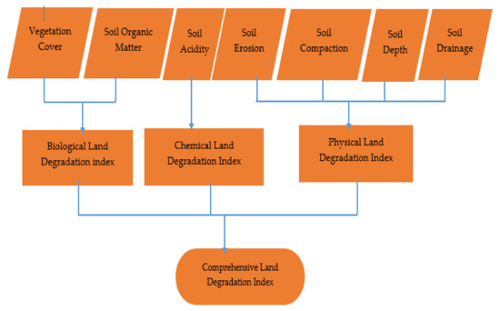 Here we implement MCA in combination with an AHP that allows pairwise comparison and applies weights to each factor when merging to a single output index [52]. Three hierarchical levels were applied (Figure 2). In the first hierarchy, individual land degradation indicator raster maps were prepared based on international standard values which were developed by organizations and scientists. In the second hierarchical level, primary indicators are grouped into classes. Vegetation cover [34] and soil organic matter [67,68] were grouped as biological land degradation indicator alternative. Soil erosion [69], soil compaction [70], soil drainage [71], and soil depth [72] were grouped as physical land degradation indicator alternatives. Soil acidity represented a single chemical land degradation indicator [68]. These groupings yielded a biological degradation index, physical degradation index, and chemical degradation index alternatives. In the final hierarchical stage, these three grouped indicators are combined into a single inclusive land degradation index (Figure 2).