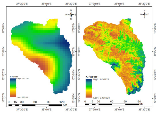 Rainfall erosivity factor (R-factor) indicates the input, which determines the sheet and rill erosion processes. R-factor depends mainly on the amount, intensity, and distribution of rainfall [80]. Soil loss is strongly associated with rainfall amount, intensity, energy, duration, pattern, and size of a raindrop through the detaching power of a raindrop striking the soil surface and for the incidence of runoff on the soil surface [82]. However, such data do not exist for the study area, due to the absence of an automatic rain-gauge, so, R-factor was generated using long-term mean annual rainfall following the equation developed by Hurni [81].