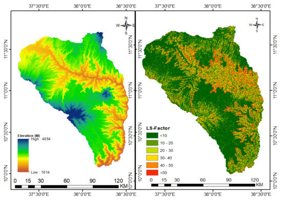 where S is a slope steepness factor, β is the slope angle in degree, and δ is slope gradient in percent. The LS-factor map was generated from a 30 m pixel resolution ASTER global digital elevation model (GDEM) [46]. After calculating L and S values the LS value was computed by multiplying the two together. As depicted in Figure 4, the LS-factor value in the study sub-basin varied from 2 to 109, but the majority of the sub-basin has LS value of less than 10 (Figure 4).