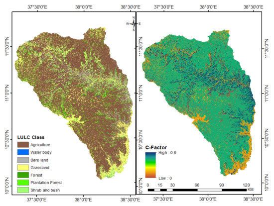 Cover management factor (C-factor) describes the effect of cropping and management practices in agricultural land and ground cover (i.e., grass and tree canopy) on non-agricultural land on reducing soil loss [26,30]. To compute cover factor values in the RUSLE model, data are required associated with the role of plant canopy, crop residues, soil management practice, surface roughness, and moisture content of soil [79,82]. Acquiring each of the parameters is difficult due to the scarcity of data for combination and calibration. Alternatively, the C-factor can be calibrated from the LULC map. Using this simpler approach, the C-factor LULC map of the study area was prepared from a Landsat 8 image acquired in January 2017 using supervised classification techniques in ERDAS IMAGINE14 [90] (Figure 5). Ground truth data were used for reference for classification and accuracy assessment validation. The overall classification accuracy was 92% and the kappa coefficient index was 0.9. After classification was performed, the raster map was converted to vector format to assign C-factor values for each LULC type based on suggestions in previous literature (Table 1). Finally, the C-factor map changed to the raster layer using the raster conversion tool in ArcGIS10.5. This method was employed by different authors in studies of the Ethiopian highlands [26,30,91,92]. The cover management factor value in the sub-basin varied from 0 on water bodies to 0.6 on bare land (Figure 5). The smallest value indicates lower susceptibility to soil erosion.