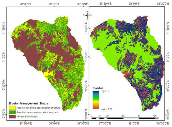 Erosion management practice (P-factor) is a measure of the effect of soil management to reduce the extent of soil loss [87,94]. It involves several types of agricultural land management practices, such as terracing, contour farming, and strip cropping [80]. Unlike the previous studies in Ethiopia [26,30,93,95], this study generated P-values from conservation technology instead of using land use and topography. To determine agricultural land management practices for this study, intensive field observation, key informant interviews, and Google Earth Pro [49] observations were employed. Soil bund, stone bunds, hillside terraces, traditional ditches, cutoff-drains, waterways, check-dams and plantation on bund, afforestation, and revegetation have been implemented to various extents. From these technologies, we considered only soil and stone bunds conservation structures because most other Sustainable land management (SLM) options observed in the sub-basin were not well-designed and not widely used. As Figure 6 and Table 2 shows, almost half of the study areas were well terraced (48%), mainly the upslope parts, while about 30% of landscape needs structural measures and 17% of the sub-basin shows no need for conservation practices. The estimated p-values ranged from 0.02 on the terraced area to 1 on non-terraced agricultural land use types. The smaller value shows less vulnerability to soil loss (Table 2 and Figure 6).