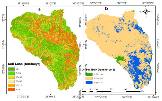 The annual soil loss (a) and soil bulk density (b) of the north Gojjam sub-basin.