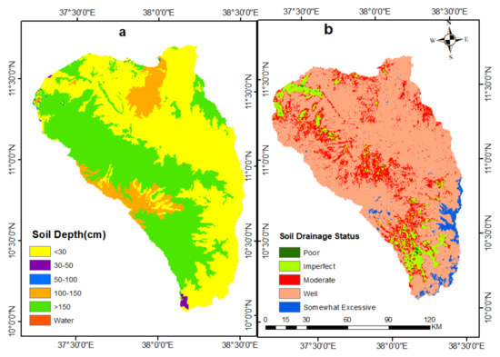 Soil bulk depth (a) and soil drainage (b) in the north Gojjam sub-basin.