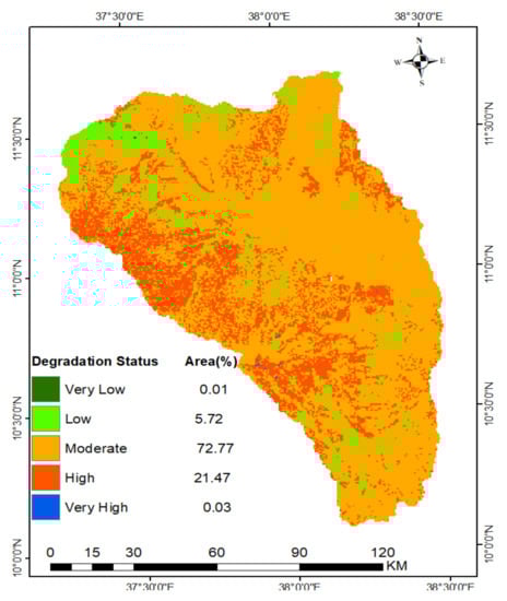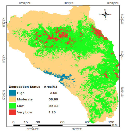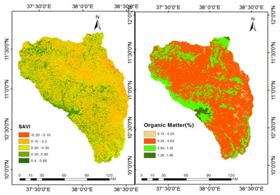 There are different indicators for assessing biological land degradation. Among others, vegetation cover, soil organic matter, and the reduction of soil organisms and soil fauna are common indicators of land degradation [99]. In this study, vegetation cover and soil organic matter were considered to estimate biological land degradation status.